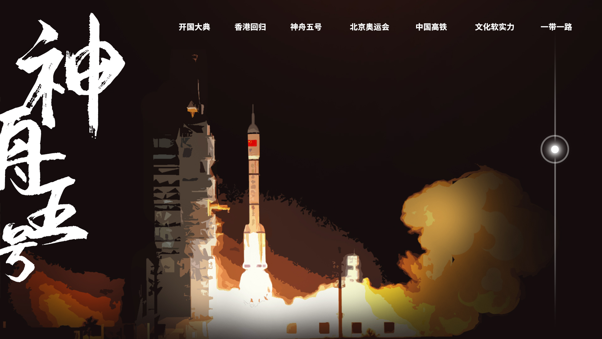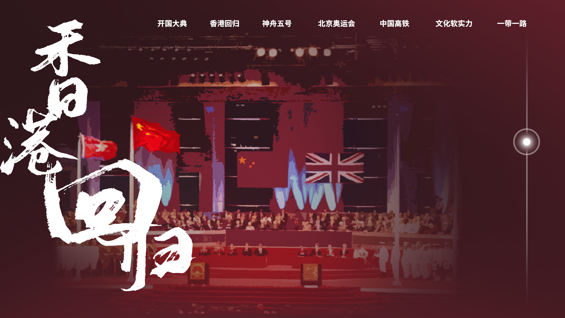 :选取建国70年来的7个典型事件,以“五星红旗”为线索和交互触点,让观众在溯游历史中感受祖国的发展历程。以下是网页首页展示。
